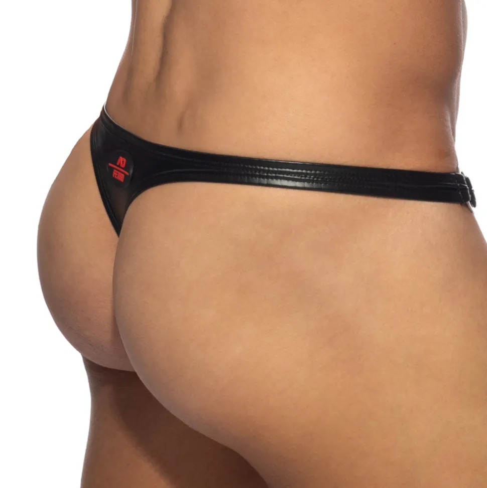 String audacieux en microfibre extensible brillante imitant le caoutchouc, pour un look très fetish. Anneau métallique de chaque côté. Poche frontale préformée, non doublée. Logo AD Fetish en silicone à l’arrière.