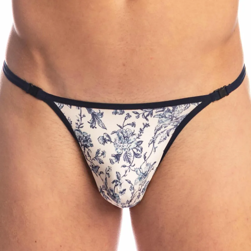 String élégant en microfibre extensible douce et confortable. Imprimé floral très raffiné inspiré de la toile de Jouy. Coupe minimaliste avec clips fonctionnels. Poche frontale ergonomique, non doublée. Design en Y à l’arrière pour mettre en valeur votre fessier.