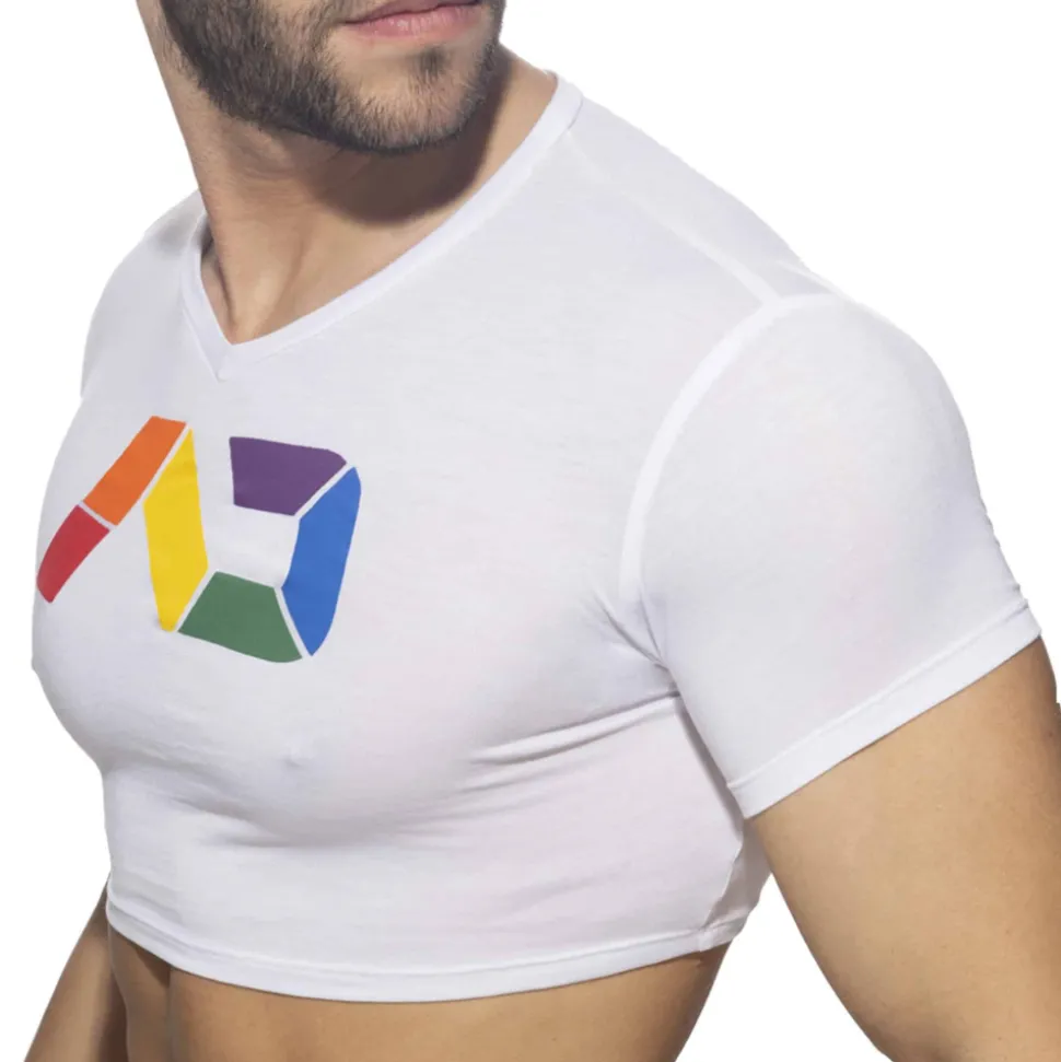 Crop top sexy en viscose douce et soyeuse. Manches courtes et col en V. Coupe ajustée. Logos AD arc-en-ciel devant et derrière.