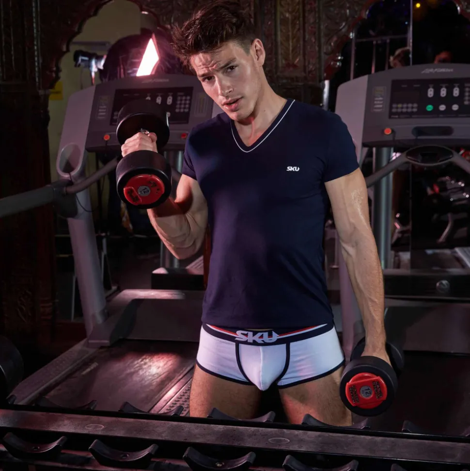 T-shirt sport et sexy en coton premium doux et extensible de couleur intense. Cintré juste comme il faut, il valorisera votre musculature sans gêner vos mouvements. Coupe courte et arrondie en bas, pour tomber parfaitement sur un pantalon. Le col en V est subtilement souligné par un liseré de couleur contrastée. Logo SKU sur la poitrine.