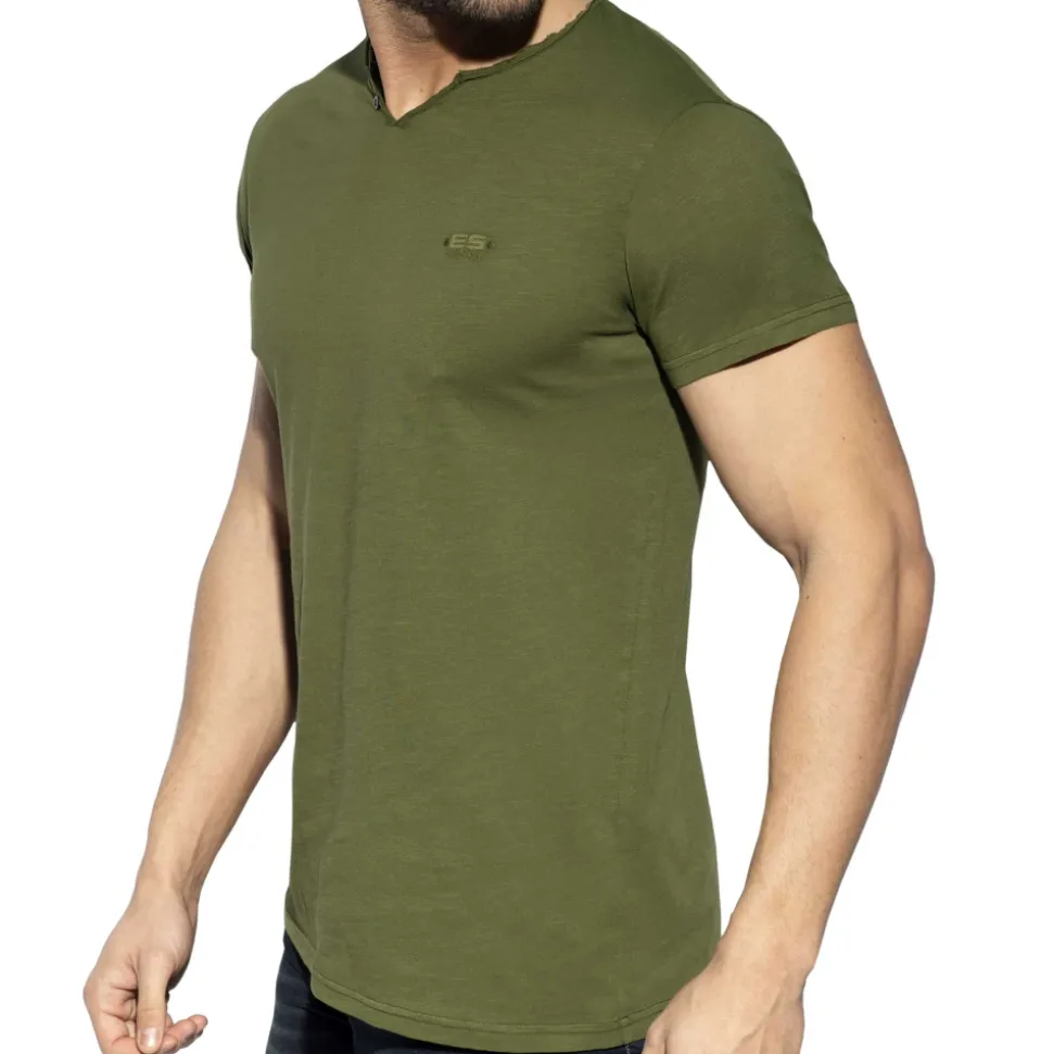T-shirt en pur coton fin et respirant de couleur unie. Coupe classique très confortable. Col en V original orné de 2 boutons décoratifs. Logo ES Collection brodé sur la poitrine.