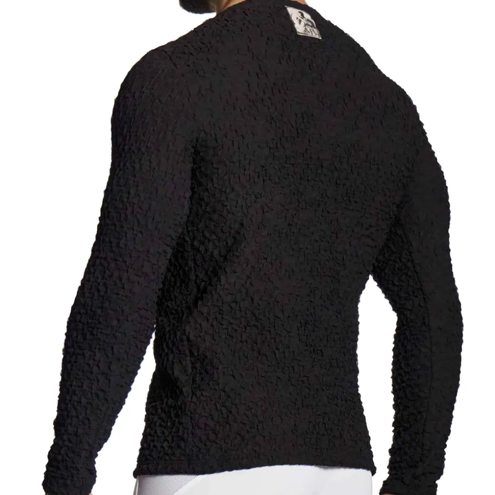 T-shirt exclusif et sophistiqué inspiré par les danseurs de ballet. Tissu innovant composé d’une base en microfibre douce et extensible recouverte de tulle froissée pour un étonnant effet 3D. Coupe ajustée avec manches longues et col bateau raffiné pouvant s’ouvrir grâce à 4 boutons. Etiquette MV représentant le nu de Flandrin en haut du dos.