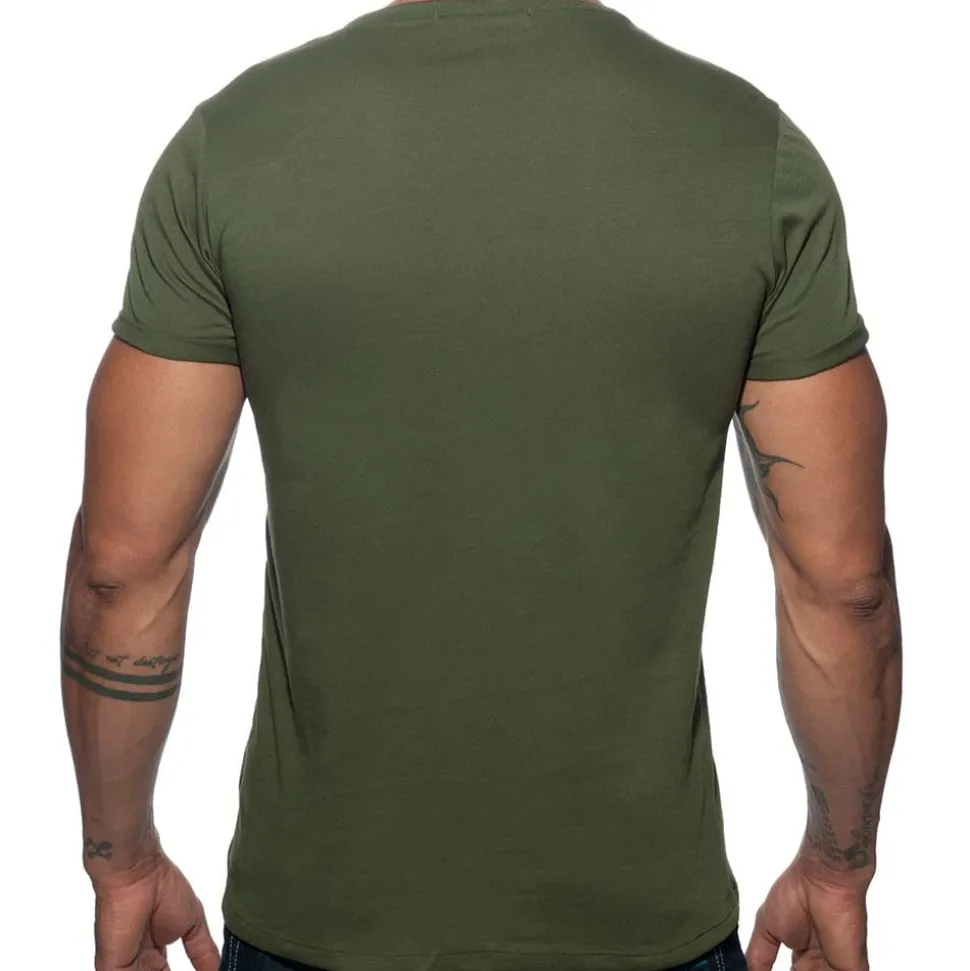 T-Shirt en pur coton doux et confortable. Coupe ajustée, manches courtes et col en V. Badge militaire et logo Addicted brodés sur la poitrine. Fabriqué à Barcelone.