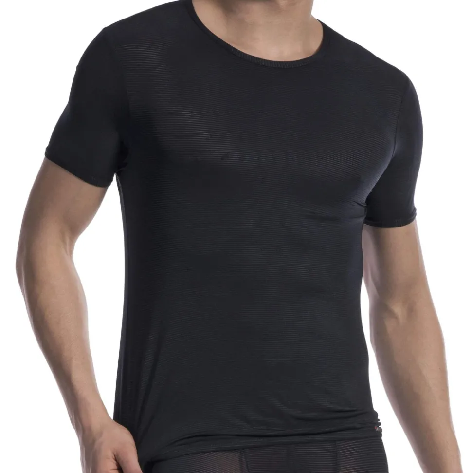 T-shirt en microfibre fine et légère. Alternance très sexy de fines rayures transparentes et opaques. Coupe ajustée, s’adapte au corps comme une seconde peau. Manches courtes et col rond. Etiquette Olaf Benz sur la hanche gauche.
