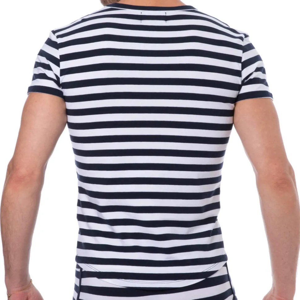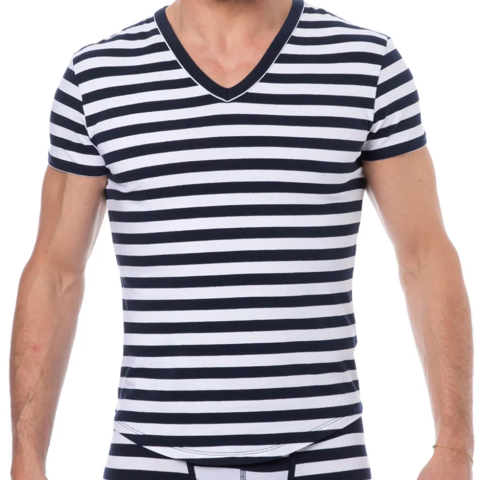 T-shirt sport et sexy en coton premium doux et extensible. Larges rayures horizontales façon marinière. Tissu yarn-dyed constitué de fils teints avant tissage pour des couleurs vives, un motif durable et un rendu exceptionnel. Cintré juste comme il faut, il valorisera votre musculature sans gêner vos mouvements. Coupe courte et arrondie en bas, pour tomber parfaitement sur un pantalon. Col en V. Bordures contrastées.
