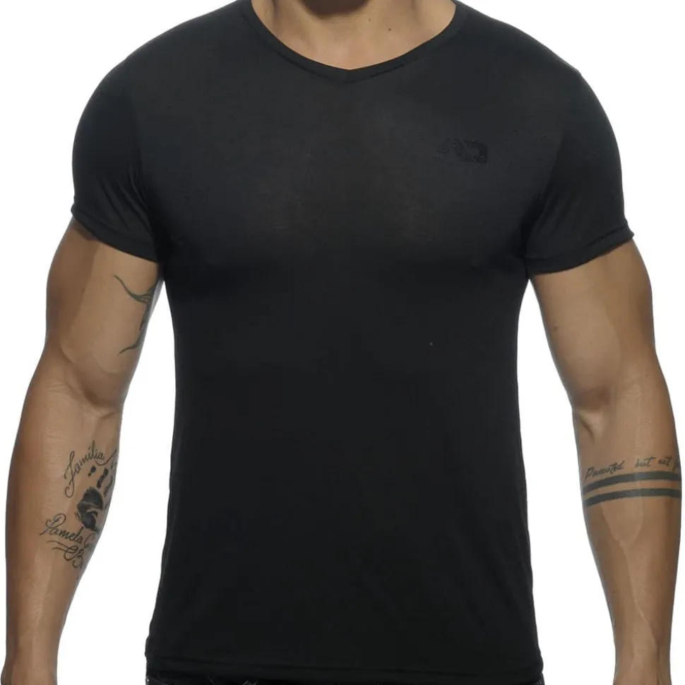 T-shirt à manches courtes et col V en matière extrêmement douce et légère. Coupe ajustée. Logo Addicted ton sur ton imprimé sur la poitrine.