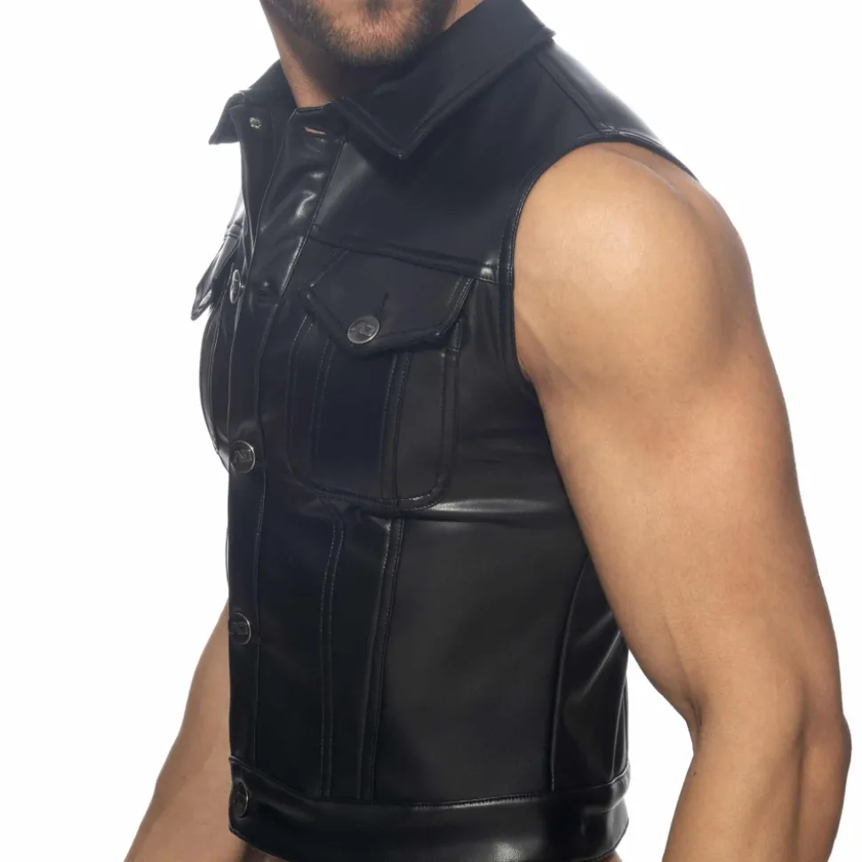 Veste biker sans manches en microfibre stretch imitant parfaitement le cuir, pour un look très fetish. Coupe courte et cintrée. Ouverture 5 boutons. 2 grandes poches plaquées sur la poitrine. Molletonnée à l’intérieur. Logo AD Fetish en silicone en haut du dos.