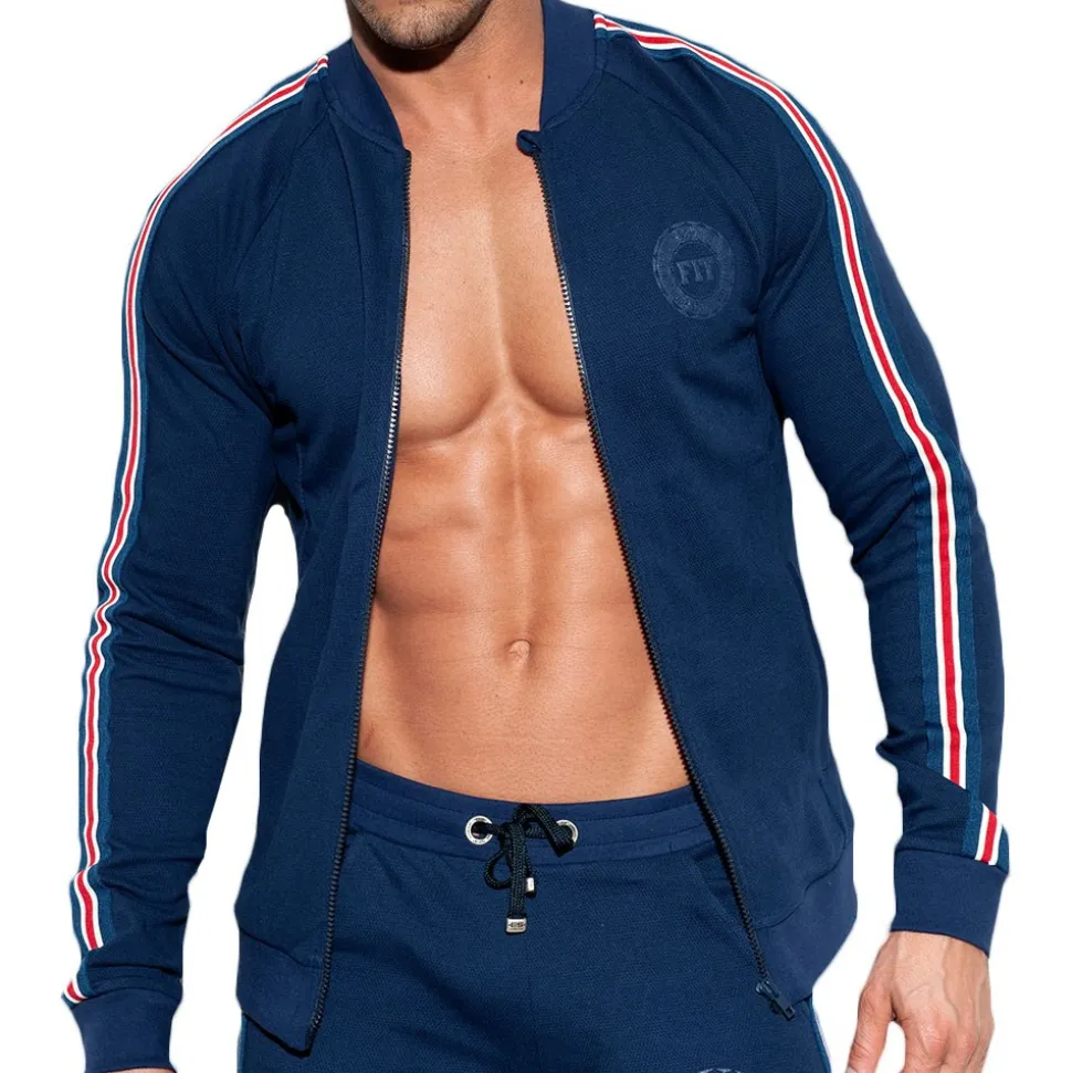 Veste ajustée en coton piqué doux et confortable. Bande sport tricolore le long des manches et des épaules. 2 grandes poches. Bandes élastiques aux poignets et à la taille. Fermeture Eclair. Ecusson ES Collection FIT sur la poitrine.