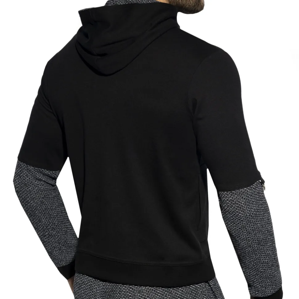 Veste sport très élégante et originale. Empiècements en tissu rustique épais. 2 grandes poches sur les côtés. Strap et boucle fonctionnelle à l’avant. Manches longues et capuche. Fermeture Eclair intégrale. Anneau métallique sur la manche droite. Logo ES Collection en silicone sur la poitrine.